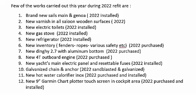 Equipment: | Solar panel, Hot water, Service batteries, Inverter, Teak in Cockpit, Teak on deck, |