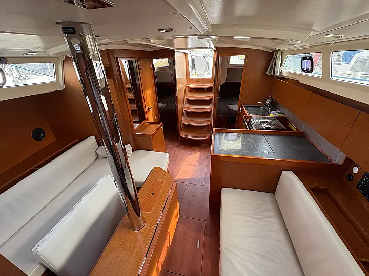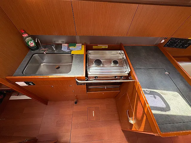 Equipment: | Binoculars, Torch, Fenders (7), Charts, Rubber, Divider, Tool box, Kitchen equipment, Bosuns chair, Winch handles, First aid, Swimming platform, Gas bottle (2), Dinghy, Shore power cable, Life jackets, Sprayhood, Autopilot, Cockpit cushions, Wind station, Echo sounder, Cockpit shower, Bimini, Lazy bag, Furling genoa, VHF, EPIRB, Compass, Fire extinguishers, Liferaft, Mooring lines, Swimming ladder, Fire extinguisher, Flares, |
