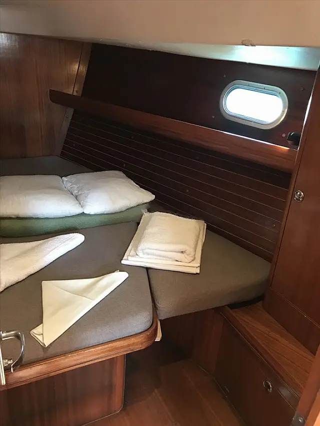 | Inventory: | Cockpit with seating area, Kitchen - completely equiped (gas stove, oven, fridge, cutlery), Autopilot, Shower, Dinghy (outbaord engine 2.5hp), Solar panels, TV/Radio/CD, Speakers, Safety equipment (Life vests, fire extinguisher), Bed linen, Outboard engine, |